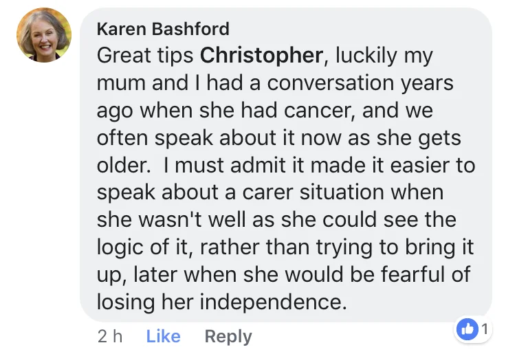 As you can see Karen recommends speaking to parents about care early, perhaps before the point where they lose their independence.